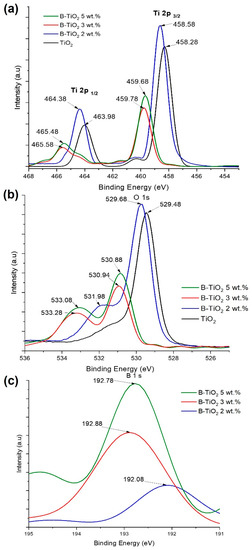 The high-resolution XPS spectra for Ti, O, and B are shown in Figure 5. The deconvolution of the Ti 2p peak from the spectra of the synthesized catalysts is depicted in Figure 5a, of which the signals of Ti 2p3/2 at 458.28 eV and Ti 2p1/2 at 463.98 eV corresponding to Ti 4+ are shifted to higher energies as the boron content is increased. This displacement indicates that the incorporation of boron in the TiO2 lattice reduces the electron density of Ti 2p [30,31].