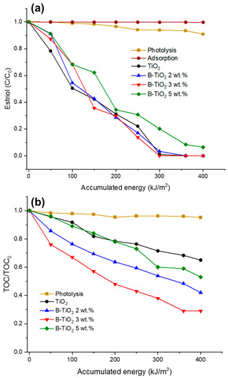 Therefore, in this study, the photodegradation of the endocrine-disrupting compound estriol (E3) using the B-doped TiO2 catalysts (2, 3, and 5 wt.% of boron content) under simulated solar light was investigated. The degradation and mineralization of the hormone molecule were evaluated at different catalyst loadings (0.5, 1.0, and 1.5 g/L), and the toxicity evolution during the photocatalytic process using a Vibrio fischeri bioassay was assessed.