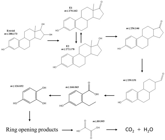 The high mineralization degree indicates that the structure of the estriol was breakdown generating single aromatic intermediates, which were further oxidized by the •OH attack through ring-rupturing reactions into aliphatic compounds [12].