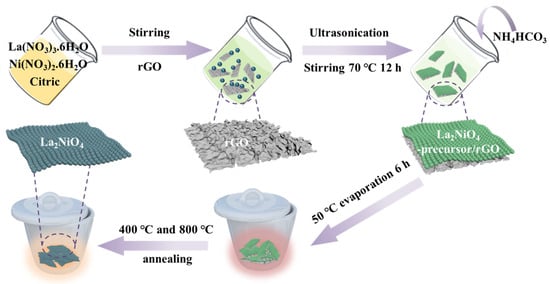 The La2NiO4-precursor was deposited on the rGO by a simple chemical impregnation method. The La(NO3)3•6H2O (0.5 mmol), Ni(NO3)2•6H2O (0.25 mmol) and citric acid (2 mmol) were dissolved in 10 mL of deionized water and 20 mL ethanol, and then transferred into a 100 mL glass beaker. Subsequently, a certain amount of rGO was added into the mixture. After vigorous stirring and ultrasonic for 15 min, the mixture was maintained at 70 °C for 12 h under constant stirring. Excess NH4HCO3 (2 g) was then added into the above mixture, and it placed in a 50 °C water bath, heated and dried to obtain the La2NiO4 precursor. The La2NiO4 precursor/rGO was treated at 400 °C for 2 h (heating rate: 4 °C min−1) and 800 °C for 2 h (heating rate: 10 °C min−1) under air atmosphere to obtain La2NiO4. All reagents were purchased from Aladdin (Shanghai, China) and were not further purified.