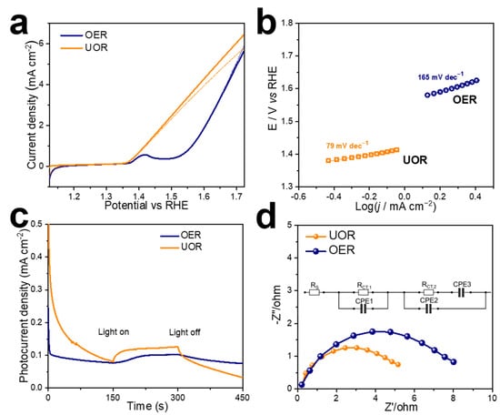 Given that the thermodynamic equilibrium potential shift from the 1.23 V vs. RHE of OER to the 0.37 V vs. RHE of the UOR favors the mass-production of hydrogen with a theoretical energy saving of ~70%, replacing the dreaded OER with UOR can result in energy efficient H2 production []. We then investigated the photoelectrocatalytic activities of La2NiO4 in 1 M KOH solution in the absence (OER) and presence of 0.5 M urea (UOR) by linear sweep voltammetry (LSV). As shown in Figure 3a, the remarkable peaks at about 1.42 V vs. RHE for the OER curves could be ascribed to the redox pair of Ni2+/Ni3+. A redox pair of symmetrical Ni2+/Ni3+ was also found in the cyclic voltammetry (CV) curves (Figure S11) [,]. Meanwhile, the LSV curve showed that the UOR onset potential for La2NiO4 was ~1.35 V vs. RHE. In comparison to the OER curve, recorded in the KOH electrolyte, the anodic current density of La2NiO4 increased rapidly after adding urea, indicating that La2NiO4 exhibited a high catalytic response activity for oxidation of urea. The NIR light irradiation could obviously accelerate the current density of UOR, with the application potential of 1.47 V vs. RHE current density of 2.00 mA cm−2 under the NIR light irradiation, while the promotion effect on the OER curve was small, with a current density of 0.38 mA cm−2 under NIR light and in the dark (Figure 3a). The photocurrent responses of the La2NiO4 catalysts were also evaluated in 1 M KOH solution for OER and UOR processes under NIR light irradiation (λ > 800 nm). As shown in Figure 3c, the photocurrent intensity of La2NiO4 for the UOR process was around 50 μA cm−2, which was much higher than that of the OER process (25 μA cm−2). Furthermore, the UOR and OER kinetics of La2NiO4 were investigated by the corresponding Tafel plots (Figure 3b). La2NiO4 had a small Tafel slope of 79 mV dec−1 for the UOR process. This value was substantially lower than that of the 165 mV dec−1 needed for the OER process, demonstrating more beneficial catalytic kinetics of UOR than OER. Further studies of the La2NiO4 electrode for UOR and OER kinetics by electrochemical impedance spectroscopy (EIS) were conducted. As shown in Figure 3d, the UOR process also had lower charge transfer resistance (Rct) values compared to OER, due to the increased rate of electron transfer between the electrode interface and the solute. The above results showed that replacing OER with UOR could greatly reduce the overpotential, and using La2NiO4 as the photoanode could save energy to produce hydrogen.
