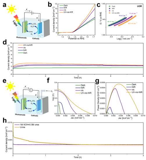 (a) Schematic diagram of the energy-saving hydrogen production process assisted by urea photoelectrocatalysis under various light source irradiations. (b) Polarization curves for the UOR of various light source irradiations. (c) Tafel plots for the UOR derived from (b). (d) Chronoamperometry responses recorded under various light source irradiations. Photoelectrocatalytic activity tests were performed in N2-saturated 1 M KOH with 0.5 M urea electrolyte. (e) Illustration of a Photocatalytic Urea Fuel Cell (PUFC), based on La2NiO4 photoanode and Pt counter electrode in O2-saturated 1 M KOH with 0.5 M urea solution under various light source irradiations. (f) Polarization curves, and (g) corresponding power density curves of the PUFC device under different light sources in 1 M KOH with 0.5 M urea solution. (h) The current-time plots at 0.1 V output voltages in urea and human urine under NIR light irradiation. The catalyst loading is 1 mg cm−2 for the DUFC performance test.