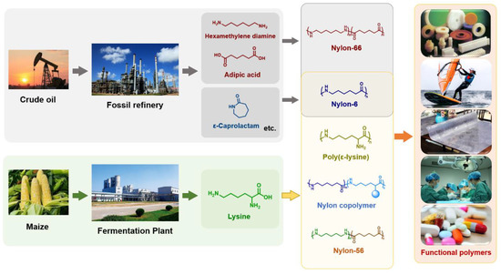 The boosting establishment of lysine industries around the world has caused fierce market competition, which thus drove the price of lysine to decrease to ca. $1.5 per kilogram since 2013 [28,31]. Such an unprofitable market environment forces enterprisers and researchers to extend the application of lysine. Interestingly, the two amines and one carboxylic acid function groups on its backbone give lysine great potential to be a platform chemical to replace fossil resources for polymer synthesis. Currently, most monomers from the polyamide and nylon families are produced from fossil refineries. Replacing fossil-based monomers with lysine derivatives would greatly expand the lysine industry and help to develop novel utilizations for bio-based commodities (Figure 1).