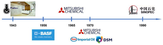 ε-Caprolactam (CPL) is an important monomer used for the fabrication of nylon-6 polymers, which is the most commonly used raw material for synthesizing fibers and resin [32,33]. The global production of CPL is anticipated to surpass 10 million tons per year in 2023. Specifically, Asian regions holds a major share in global CPL output due to the commissioning of new and expansion of existing facilities and will be expected to grow at ca. 4% per year in the next few years [34]. The fossil-based CPL production process has gone through a long period of development and evolution (Figure 2). In 1919, the IG Farben company took the lead in developing the CPL synthesis process, and the first industry for CPL production was established in 1943. Phenol was used as the starting material, from which cyclohexanone was produced and then converted to the corresponding oxime with hydroxylamine. In this process, hydoxylamine was produced by the Raschig method [35]. BASF replaced the Raschig method with the NO reduction method to produce hydroxylamine in 1956 [36]. Since the 1970s, several new technologies including the boric acid (BA) and hydroxylamine phosphate (HPO) methods invented by Mitsubishi Chemical, Du Pont and Royal DSM N.V. have been applied, which thus drove a sharp increase in global CPL productivity. In the 1990s, SINOPEC developed a series of sustainable technologies for CPL production, including a green oxidation process for cyclohexanone synthesis from benzene, gas-phase Beckmann rearrangement of cyclohexanone oxime and CPL purification with amorphous Ni-based alloy catalysts (Figure 3) [37,38]. These synthesis strategies greatly expand CPL productivity and supported China to dominate worldwide CPL production. Currently, 90% of CPL is produced via the aforementioned cyclohexanone route. However, the unavoidable complicated processes and fossil-based raw materials bring CPL an uncompetitive prospect. An alternative route for CPL synthesis with renewability, eco-friendliness and economic viability is highly desirable. To this extent, lysine is an ideal raw material with low-cost and green separation processes.