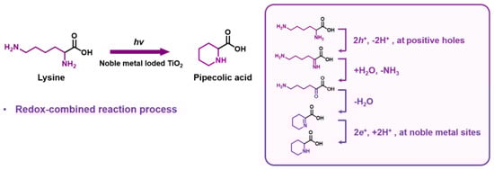 To date, several pathways have been developed for the production of pipecolic acid, including enantioselective reduction, diastereoselective synthesis, stereoselective transformation and condensation−deamination processes from various reactants [90,91,92]. Among these methods, deamination of lysine to pipecolic acid is considered as the most reliable and sustainable pathway by virtue of the easy access to raw materials and simple reaction procedure. Typically, catalysts holding TiO2 species performed better than other catalytic systems [93]. S. Nishimoto et al. first discovered that TiO2 (anatase crystal phase) supported with Pt nanoparticles could convert lysine to pipecolic acid under photoirradiation at ambient temperatures. The authors attributed the brilliant reactivity to the larger surface area with fewer defects and the higher dispersion of Pt nanoparticles acting as an efficient reduction site for a Schiff base intermediate during the catalytic process [94]. B. Ohtani et al. elucidated the redox-combined mechanism of photocatalytic conversion of lysine into pipecolic acid via rigorous isotope measurements [95]. The detailed influence of the reaction environment on the selectivity of chiral synthesis of pipecolic acid has been found by S. Chuang et al. It was demonstrated that the chiral selectivity toward lysine was found to be governed by the stereo-structure of the adsorbed lysine and the crystal structure of TiO2 [96].