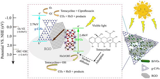 The proposed mechanism for antibiotic photodegradation (tetracycline and ciprofloxacin) using BiVO4/reduced graphene oxide (RGO)/g-C3N4 Z-scheme photocatalysts. Adapted from [73] with permission. Copyright 2022 Elsevier.