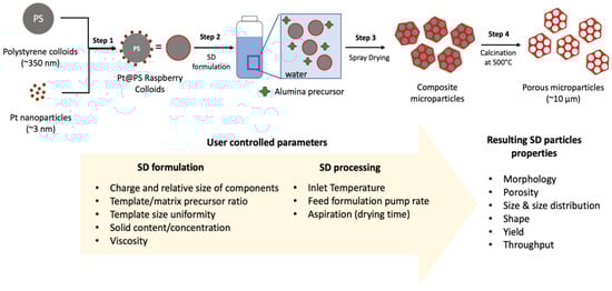 In this study, we use the RCT approach to synthesize spray dried catalytic microparticles consisting of Pt NPs supported on Al2O3 (SD Pt/Al2O3). We identified the optimal spray drying conditions and SD slurry formulations to produce uniform, highly porous SD microparticles with Pt NPs uniformly distributed throughout the structure, uniquely at pore/matrix interface, with none fully encapsulated within the matrix. The shape of resulting microparticles is typically toroidal as determined by the multiple components with different sizes and physical properties in spray drying formulation. In contrast, microparticles fabricated from a single component, boehmite nanoparticles (precursor to alumina metal oxide matrix), were typically spherical. We found that loading of Pt NPs on the surface of polymer templating colloids significantly influences the surface morphology of the resulting SD microparticles, attributed to the change in surface charge of the raspberry colloids (polystyrene (PS) spheres decorated with Pt NPs) which in turn destabilizes the interparticle interactions in SD slurry. Our optimized SD process enables the production of hundreds of grams of RCT-based powders per batch with yields of 60–70%. We demonstrate that the SD microparticles have comparable catalytic activity in the oxidation of toluene (model reaction) to RCT catalysts with the same Pt loading prepared using the initially published lab-scale procedure (Shards Pt/Al2O3) [,].