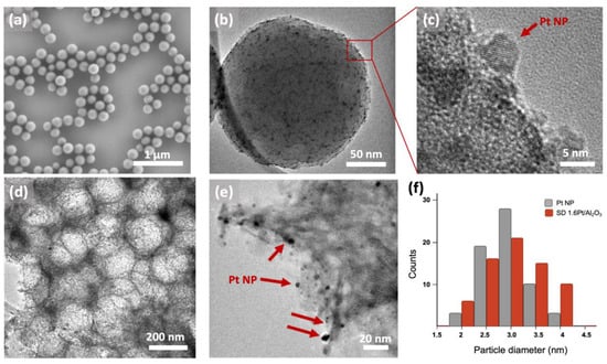 Representative scanning and transmission electron microscopy (SEM and TEM) images of material building blocks and resulting SD 1.6Pt/Al2O3 powders synthesized using 1.6Pt@PS raspberry colloids. (a) SEM and TEM (b,c) images of 1.6Pt@PS raspberry colloidal particles with (c) showing a high magnification TEM image of (b) in which the Pt NPs attached to the surface of PS colloid are more clearly visible. (d,e) Representative TEM images of SD 1.6Pt/Al2O3 catalyst powders with (e) showing a higher resolution image where Pt NPs are visible at the pore-matrix interface. (f) Histogram of the measured NP size distribution for as-prepared Pt NPs (gray) and those within the RCT SD Pt/Al2O3 powder catalyst after calcination at 500 °C (red), values determined from TEM images using ImageJ. At least 100 NP were analyzed. The diameter of NPs before and after calcination were measured to be 2.8 ± 0.5 nm and 3.2 ± 0.7 nm, respectively, indicating only minor sintering.