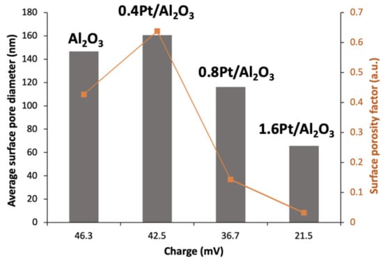 As can be seen from high magnification images in Figure 3 (bottom row) and Figure 4, the average surface pore diameter (Dsp) and the number of pores per surface area (surface porosity factor, fp) strongly depend on the charge of the templating colloids. For an open surface morphology, both the templating particles and the matrix precursor must have a similar surface charge. In our system, the templating colloids and Bh particles were positively charged, though the modification of PS colloids with Pt NPs resulted in a decrease of their positive charge which has an effect on SD particle morphology, as mentioned above. For SD Al2O3 and SD 0.4Pt/Al2O3 the Dsp values were somewhat similar, 146.7 (±9.8) nm and 160.6 (±13.7) nm, respectively (Figure 4, gray columns), likely due to the similarity in the charge of the respective templating colloids: 46.3 mV for unmodified amidine capped PS and 42.5 mV for 0.4Pt@PS. Further increase in the Pt loading significantly reduced the charge of the raspberry templating colloids and, consequently, the surface pore diameter in resulting SD microparticles: Dsp = 116.2 and 65.7 nm for the particles with 0.8 and 1.6 wt.% Pt, respectively (Figure 4, gray columns). In addition to surface pore diameter, the number of pores per surface area had an even larger dependence on templating colloid charge as the reduction of positive charge leads to more Bh particles packing between the templating colloids and thus a larger pore spacing. Determination of the surface porosity factor, fp, (pore area/total area) was performed by selecting a rectangular area of 1 square micron and measuring the number of pores within that area. The total area of the pores was then calculated by approximating the pores as circles and the porosity factor is calculated as the total area of the pores divided by the area of the rectangle. For SD Al2O3 and SD 0.4Pt/Al2O3 the fp values were 0.43 and 0.64, respectively, while for SD microparticles with increased Pt loading of 0.8 and 1.6 wt.% Pt, the fp values were 0.14 and 0.03, respectively (Figure 4, orange line).