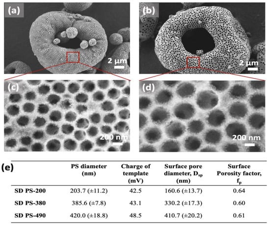 Control over pore diameter in SD microparticles using various sizes of PS templating colloids. (a,b) SEM images of RCT SD 0.4Pt@PS with PS sizes of 385.6 nm (a,c) and 420.0 nm (b,d), respectively. (e) Table summarizing the measured results.