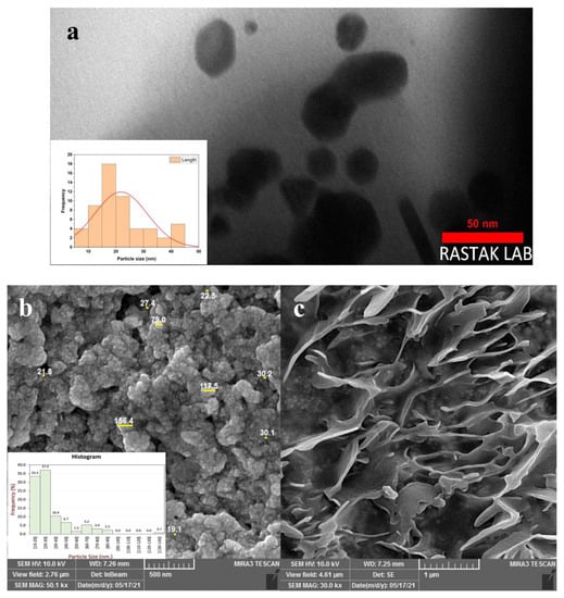 (a) The TEM image and the histogram reported from TEM image; (b,c) the SEM images at 500 nm and 1 µm magnifications and the histogram obtained from image 500 nm magnification.