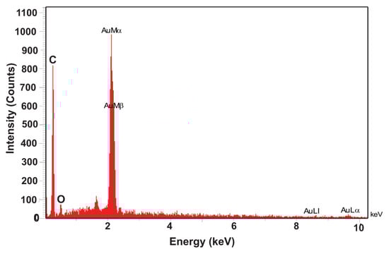 EDX analysis was used to identify atomic compositions of CC-AuNPs, indicating a strong gold signal (2.2 keV) in the biosynthesized CC-AuNPs (Figure 3). In addition, the presence of C (0.27 keV), O (0.52 keV), and other impurities in the EDX spectra confirmed phytochemicals existing in the CC-extract [,,]. The findings of Liu et al. proved the formation of AuNPs (by Zooglea ramigera) with EDX signals at 2.2 keV and 8.5 keV, which was similar to our result [].