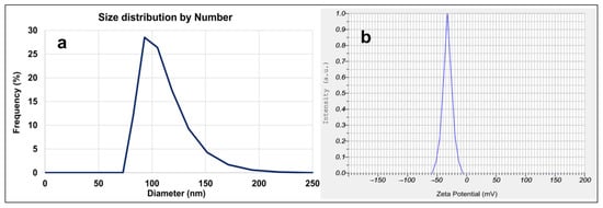 The hydrodynamic diameter of synthesized CC-AuNPs was assessed using DLS analysis, indicating the mean size of 101.4 ± 19.6 nm by number (Figure 4a,b). DLS analysis for gold nanoparticles synthesized by Moringa oleifera petals displayed an average hydrodynamic size of 203 nm []. In another study, the DLS analysis of AuNPs prepared using Scutellaria barbata yielded an average size of 154 nm []. It is to be expected that the particle size determined by TEM and DLS scattering differs slightly due to the differing measurement methods []. The stability of nanoparticles was determined by zeta potential that was determined as −30.8 ± 1.5 mV for the prepared CC-AuNPs. The phytochemicals, acting as capping agents, can produce repulsive forces on the surface of nanoparticles that make them stable [].