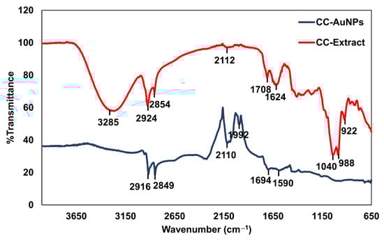 The FT-IR analysis was carried out to demonstrate the presence of the functional group and biomolecules in C. caspius extract. The roles of the extract as a reducer and a stabilizer stem from the availability of these groups. The FT-IR spectrum of the CC-extract and extract-mediated AuNPs (CC-AuNPs) is depicted in Figure 5. The peaks at 3285 cm−1 confirm the presence of the stretching vibration of phenolic hydroxyl [,]. The role of phenols as free radical scavengers has been clarified in recent years []. The peaks located at 2924 and 2854 cm−1 are associated with saturated hydrocarbons (Csp3–H) []. Recently, it has been mentioned that the appearance of hydroxyl and carboxyl ions attests to the fact that the biomolecule could form the protective layers to stabilize the metal NPs []. The peak region of 2112 cm−1 was associated with stretching bands of the -C≡C- [], 1624 cm−1 peak (stretching band of the carboxyl coupled to the amide I band) [], 1708 cm−1 for carbonyl functional group [], and C-N stretching vibrations of aliphatic amines and C-O stretching vibrations of alcohols at 1040 cm−1 have also been observed in our analysis [,]. The bands appearing at the wavenumbers 988 and 922 cm−1 indicate ν(=CH trans out of plane bending) and ν(=CH cis out of plane bending) vibrations [,]. As observed from the FT-IR spectra of the CC-AuNPs, the IR bands of the phenolic hydroxyl (around 3285 cm−1 in the case of the CC-extract) almost drastically vanished, which confirms their complete incorporation in the reduction and stabilization of the nanoparticles. In other words, through the breaking of O–H bonds and subsequent release of electrons due to the flavonoid and phenolic compounds, the Au (III) ions are converted into Au(0) []. Furthermore, this mechanism is speculated to be responsible for hindering the agglomeration of nanoparticles, which eventually control their size and shape []. Comparing the peak position of AuNPs with those of CC-extract, the peak intensity at 1694 cm−1 and 1590 cm−1 for CC-AuNPs diminished with slight shifts to lower wavenumber. After the production of CC-AuNPs, a sharp peak appeared at 2110 cm−1, which related to the interaction between gold and CO. In other words, CO can be adsorbed on AuNPs and form CO-Au(0) species. In fact, this could be the reason for the decrease in the intensity of the peaks at 1694 and 1590 cm−1 in the AuNPs spectra []. Furthermore, one could distinguish some shifts to lower wavenumber, suggesting that the biomolecules act as capping agents on the surface of nanoparticles []. Our observations have clarified that phytochemical compounds (phenols, flavonoids) in the extract promote the formation of AuNPs and the binding of the biofunctional groups on the surface of synthesized AuNPs; these results are confirmed using several studies [,,].