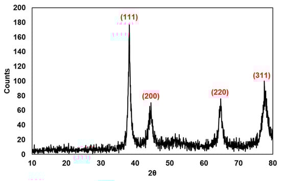The crystalline nature of the NPs was evaluated by X-ray diffraction (XRD). The XRD pattern of biosynthesized AuNPs using the C. caspius extract is presented in Figure 6. The diffractogram shows four main diffraction peaks at about 2θ = 38°, 45°, 65°, and 78°, which are indexed to the (111), (200), (220), and (311) lattice planes, respectively. The identified peaks follow the reference of face-centered cubes (FCC) structure of metallic Au, from the Joint Committee of Powder Diffraction Standard (JCPDS) Card No-004–0784 [,]. The mean crystallite size of C. caspius extract-mediated AuNPs was found to be around 34.18 nm, which was calculated using the Debye–Scherrer equation (particle size D = (k × λ)/(β cosθ)) []. The XRD studies of AuNPs prepared by a cheap Sphaeranthus indicus extract illustrated the FCC structure of metallic Au with a mean size of 37.96 nm [].