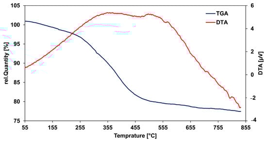 TG/DTA analysis was applied to define the thermal stability and the total amount of phytochemical residuals of the synthesized CC-AuNPs []. The green synthesized CC-AuNPs were heated from 55 °C to 800 °C, indicating about 22% weight loss (Figure 7). Based on the TGA spectrum, weight loss was shown to occur in the ranges from 55 °C to 255 °C (with slight weight loss) and 255 °C to 455 °C (with high weight loss). The weight loss at 55 °C to 100 °C can be related to residual water evaporation []. In addition, the residual mass was related to the decomposition of capping biomolecules on the surface of CC-AuNPs [,]. Higher temperatures showed no critical weight loss, indicating the thermal stability of CC-AuNPs.