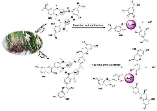 The HPLC method used for determining the content of flavonoids and phenolic acids in C. caspius extract used a binary isocratic solvent system. The HPLC analysis showed that the main bioactive compounds in this extract are gallic acid, catechin, caffeic acid, p-coumaric acid, and rutin (Table 1). HPLC analyses revealed that catechin was the major phenolic component in the extract with 8.4 mg/g plant, which was higher than other standards. The mechanism of AuNPs formation by phytochemicals existing in C. caspius extract is offered in Figure 8. The catechol moiety of the flavonoid structure or phenolic acids helps synthesize AuNPs; two e− are released from the ring, reducing Au(III) ions to Au(0), leading to the oxidation of catechol to 3′,4′-quinone ring. In the following, Au is aggregated to larger clusters and produces AuNPs. Furthermore, the quinone type of the bioactive compound is bound to the surface of NPs, reducing the aggregation of Au(0) on the nanoscale [,,,].