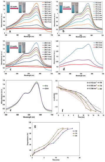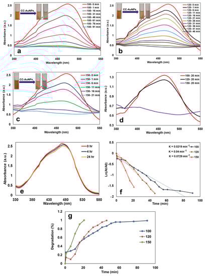 One of the most challenging problems for the environment is the removal of nonbiodegradable organic chemicals from industrial waste. Nanoparticles exert a potent degrading activity on organic dyes because of their high surface area []. In this work, the catalytic degradation of MO, MB, and 4-NP was studied in the presence of the prepared CC-AuNPs and NaBH4 (Figure 10, Figure 11 and Figure 12). Various contents of CC-AuNPs (100, 120, and 150 µL × 425 µg/mL) were mixed with MO and NaBH4 solution, changing the solution color (from orange to colorless) at 91, 46, and 21 min, respectively (Figure 10a–c). Based on the obtained data, a higher content of CC-AuNPs decreased the degradation reaction time (Figure 10d). As shown in Figure 10e, the absorbance spectrum of MO was unchanged without CC-AuNPs at 470 nm, even over 24 h. Therefore, the reduction reaction was very slow in the absence of a nanocatalyst. The reaction kinetics were pseudo-first order, and the MO degradation rate constants were calculated as 0.0219 min−1, 0.04 min−1, and 0.0729 min−1 for 100, 120, and 150 µL, respectively (Figure 10f). These data showed that the surface area of nanoparticles increased with increasing nanocatalyst content, therefore causing at increase in the reaction rate constant. The degradation percentages of MO using 100, 120, and 150 µL of the biofabricated CC-AuNPs were found to be 99, 99.3, and 100%, respectively (Figure 10g), showing the good catalytic effect of our AuNPs. The obtained results have been supported by previously published findings for green-prepared AuNPs as catalysts [,].