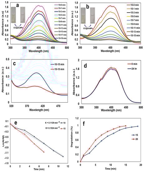 UV–Vis absorption spectra of 4-NP reduction with NaBH4 catalyzed by (a) 10 µL, (b) 15 µL of CC-AuNPs (425 µg/mL), (c) the comparison of different volumes of CC-AuNPs (10 and 15 µL). (d) UV-Vis spectra of 4-NP reduction with NaBH4 without nanocatalyst, (e) the corresponding plots of ln(At/A0) vs time, (f) degradation percentage of 4-NP.