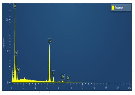 EDX is considered a well-established technique for the chemical mapping of compounds and provides sufficient information regarding their elemental composition. EDX analysis was performed to quantify the elemental composition of the NPs in terms of the weight percentage of different metals. In the spectrum, different peaks were observed rendering Fe (58.07%), Zn (08%), and O (30%), which confirms the presence of expected elements in the catalyst (Figure 2).