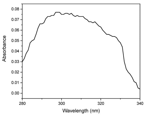 The UV-Visible spectrum of the Zn/iron oxide was obtained to investigate its optical properties, as shown in Figure 3. The Zn/iron oxide exhibited the maximum absorbance at 300 nm. Previous studies describe the maximum absorbance of particles with varying values in the range of 280 nm to 367 nm based on the design of synthesis and use of chemicals [].