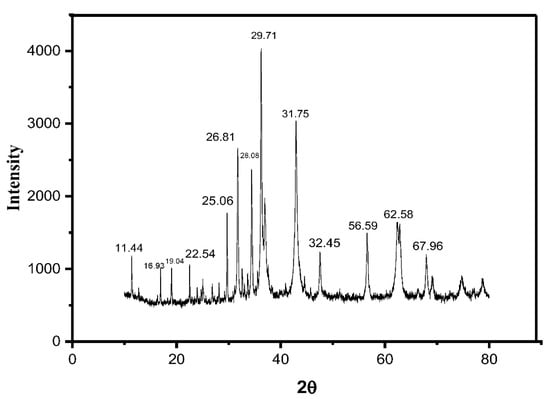 The XRD spectrum in Figure 6 shows defined sharp peaks of the annealed catalyst presenting its crystalline nature. The well-defined peaks corresponding to the 2θ were 11.44° 16.93°, 19.04°, 22.54°, 25.06°, 26.81°, 28.08°, 29.71°, 31.75°, 32.45°, 56.59°, 62.58°, and 67.96°. These peaks were in accordance with the previously reported literature [,] having crystalline plane at 100, 101, 311,110, 440, and lattice constants a = b = 0.314 nm and c = 0.511 nm (JPCDS card number: 36-4926) [].