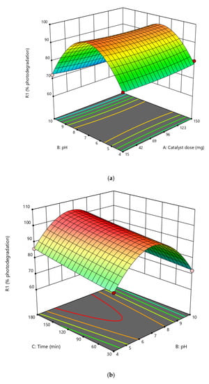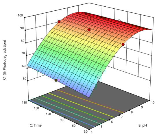 The model’s optimized parameters were pH 6.9, time 105.3 min, catalyst dose 25.2 mg, and dye concentration 48.5 mgL−1. The dye’s predicted percentage photodegradation was 99%. 3D surface plots representing the relationship between the significant terms of the model are given in Figure 8.