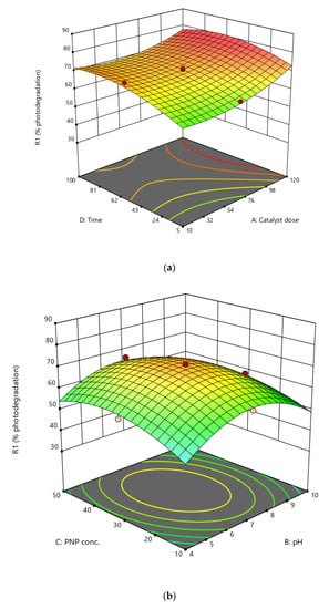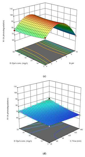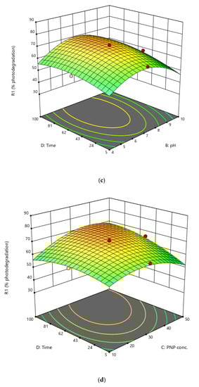 The lack of fit was not-significant, with a p-value of 0.0659. 3-dimensional RSM contour plots depict the inter-parameter interactions (Figure 9). The third parameter was maintained at its optimum value to find the interaction effects between each pair of variables and their optimum values were shown by using 3D surface plots. The model-derived optimal values for the four parameters were pH 7.1, time (t) 94 min, catalyst dose 112.5 mg, and dye concentration 39.5 mgL−1. Phenol’s predicted percentage photodegradation was 78.1. The experimental value (79.8) and the predicted value of binding capacity were compared and found closely related.