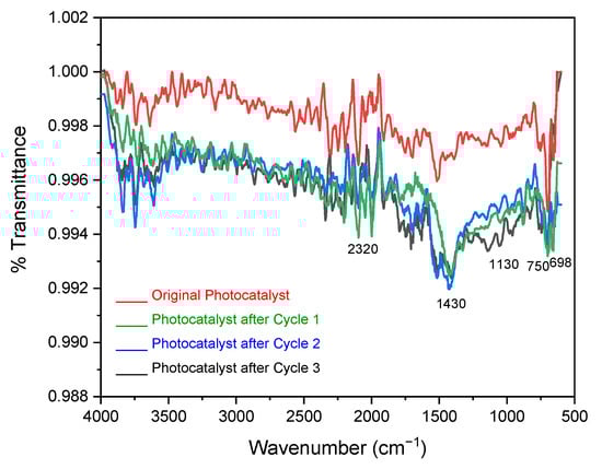 As a common approach, a long-term cycling experiment is performed to evaluate the stability and degradation efficiency of the catalyst during its multiple reuses. The synthesized photocatalyst was regenerated for three consecutive cycles and FTIR after each analysis was taken. A careful study of spectra showed similar bands as present in the spectrum of unused photocatalysts (Figure 5) confirming the retention of basic structure. Some additional bands at positions 1430 corresponding to −NH bending [] and 1130 cm−1 (stretching vibration of SO(SO3H)) [], were observed that could possibly be due to the residues of pollutant (Congo red) left on the catalyst’s surface (Figure 11).