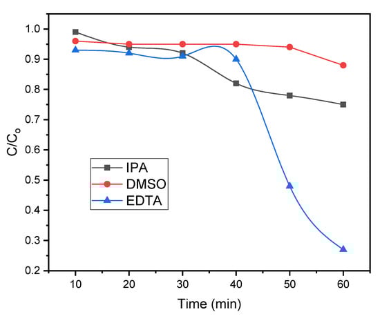 In the case of the Zn/iron oxide catalyst, dimethyl sulfoxide (DMSO) presented the maximum scavenging ability (Figure 13). It is a well-known scavenger of OH•. OH• Scavengers react strongly to e− as well. Only 50–54% of e− species survive the DMSO reactions at high scavenger concentrations []. It is obvious that the photodegradation efficiency is strongly dependent on the amount of DMSO because it is a typical radical OH• scavenger in photocatalytic systems []. Pollutants are directly attacked by OH• radicals. The reaction rate should be slowed down in the presence of DMSO. The predicted mechanism of free radical formation in the H2O2/DMSO system presupposed that hydroxyl radical and superoxide anion was produced during the breakdown of hydrogen peroxide, and that methyl radical was produced during the hydroxyl radical’s breakdown of DMSO. Alkaline may encourage this reaction. As contaminated trace iron acts as a catalyst in the conversion of superoxide anion to hydroxyl radical, the amount of hydroxyl radical is comparatively higher than that of superoxide anion [].