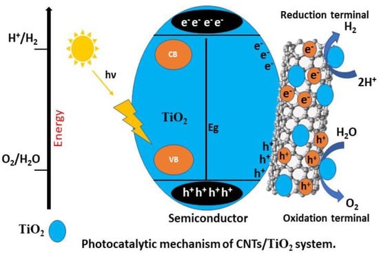 Regarding photocatalysis, CNTs are attractive carbon semiconductors due to their unique electrical properties, such as high conductivity and electroluminescence, as well as their vast surface area and high tensile strength [,]. Coupling CNTs with other catalytic materials can improve their photocatalytic activity. The solvothermal decomposition of a single-source molecular precursor in the presence of ethylene glycol resulted in a CNTs/CdS composite []. CdS is an advanced semiconducting substance that, in its purest state, can evaluate hydrogen at a rate of 14.5 µmol·h−1 g−1 with 0.1 M Na2S and 0.05 M Na2SO3 used as a sacrificial agent under a xenon lamp. The CdS/CNTs composite material improves hydrogen photocatalytic activity and yields 52 µmol h−1 g−1 of hydrogen under identical conditions []. Iron oxide nanoparticles have excellent adsorption, biocompatibility, and electrocatalytic activity. Although iron oxide nanoparticles have several advantages, they are limited in electrochemical sensors due to poor dispersion and high levels of aggregation [,]. Multi-walled carbon nanotubes/iron oxide nanocomposites MWCNTs/Fe2O3 can be prepared by the in situ flame synthesis method and are an efficient photocatalyst for hydrogen synthesis []. The photoelectrochemical H2 efficacy of MWCNTs/Fe2O3 nanocomposites is 85 L h−1 m−2 []. TiO2 absorbs only a little percentage of solar UV radiation and endures photogenerated charge carrier recombination. TiO2 has been modified with carbonaceous materials (Figure 3), absorbing more solar energy and slowing down the electron-hole recombination process []. Compared to a pure TiO2 semiconductor, the photocatalytic material consists of functionalized carbon nanotubes and titanium dioxide (TiO2/FCNTs) prepared by the arc discharge method and shows significantly increased hydrogen production at a rate of 2134 mmol·h−1 g−1 under solar irradiation and glycerol as a sacrificial agent. [,].