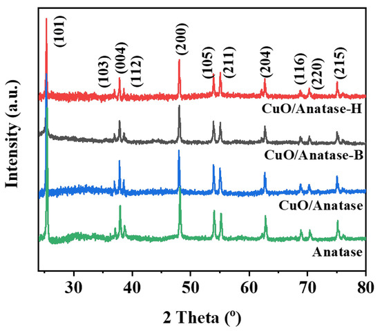 First, we have synthesized a series of CuO/anatase catalysts with oxygen vacancies by different methods, and the textural properties of the catalysts were characterized by X-ray diffraction patterns (XRD). As shown in Figure 1, the characteristic diffraction line of the prepared anatase is consistent with the anatase phase (LCPDS Card No. 21-1272) [26]. After the Cu species were loaded on it, no new diffraction lines were observed, indicating that the content of the Cu species is too low [15,27]. Simultaneously, after the reduction treatment by NaBH4 or H2, the characteristic diffraction lines of the catalysts did not change, suggesting that the reduction treatment will not change the crystal structure of the catalyst. Moreover, the intensity of the diffraction line on (101) facet follows the following order: anatase > CuO/anatase > CuO/anatase-B > CuO/anatase-H, indicating that both the Cu incorporation process and the reduction treatment can bring lower crystallinity and the shift of the CuO-anatase samples to lower degrees, which indicates that the Cu species has been doped into the TiO2 lattice matrix. This result can lead to notable crystal distortion. In addition, compared to the samples without the reduction treatment, the relative intensities between diffraction lines on (105) vs. (211) and (116) vs. (220) were changed, suggesting that the reduction treatment brings different effects on different crystal phases.