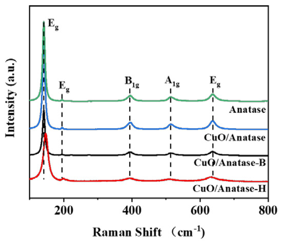 Raman spectra were measured to further confirm the surface crystal structure of the catalysts. As shown in Figure 2, five typical bands, which can be assigned to Eg (141, 196 and 638 cm−1), B1g (395 cm−1) and A1g (515 cm−1) Raman modes of anatase, were observed, which further explained that only pure anatase exists in the four prepared catalysts [28]. This result is consistent with the XRD result. Compared with anatase, a pronounced broadening and weakening mode was observed of the Raman spectra (CuO/anatase, CuO/anatase-B and CuO/anatase-H) at 141 cm−1. Moreover, a significant red shift also occurred at 141 cm−1 of the CuO/anatase, CuO/anatase-B, and CuO/anatase-H catalysts. Especially, the CuO/anatase-H catalyst shows the most serious red shift, indicating a significant surface lattice distortion. The above results show that the H2 reduction treatment is able to create more defects on the anatase surface than NaBH4.