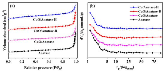 As shown in Figure 3, the nitrogen (N2) sorption profiles were also recorded to investigate the textural properties of the catalysts. As shown in the N2 adsorption–desorption isotherms (Figure 3a), the anatase, CuO/anatase, CuO/anatase-B and CuO/anatase-H catalysts all show the typical type-IV isotherms with the type H3 hysteresis loops at a high relative pressure [29,30,31]. The pore size distributions for different catalysts are displayed in Figure 3b. The pore size of the four catalysts is centered at about 2−40 nm, indicating the existence of a mesopores structure on the catalysts surface [29]. The specific surface area of the four catalysts is summarized in Table 1. The BET surface areas of the anatase, CuO/anatase, CuO/anatase-B and CuO/anatase-H are 34.87, 31.72, 33.51 and 32.97 m2/g, respectively. After the Cu species were doped on the anatase and the reduction treatment, the BET surface area is almost unchanged, which suggests the structure of the catalysts is stable. In addition, the inductively coupled plasma optical emission spectrometer (ICP−OES) was used to detect the loading of the Cu species on the CuO/anatase, CuO/anatase-B and CuO/anatase-H catalysts. As shown in Table 1, the actual Cu loading was detected to be 4.9, 4.9 and 4.6, which is a little different among the four catalysts.