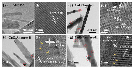The (a,b) TEM and HRTEM images of anatase, (c,d) TEM and HRTEM images of CuO/anatase, (e,f) TEM and HRTEM images of CuO/anatase-B and (g,h) TEM and HRTEM images of CuO/anatase-H catalyst (red circles: CuO nanoparticles; yellow arrows: distortions of lattice fringes).