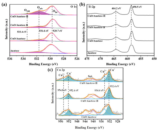 The composition and valence of the elements on the catalyst surface were determined by X-ray photoelectron spectrum (XPS) analysis, and the results are shown in Figure 5 and Table 2. As shown in Figure 5a, the XPS profiles of O 1s are deconvolved by the Gaussian–Lorentz function, and the peak can be fitted into three peaks. The binding energy of the peaks at about 529.7 eV is assigned to the lattice oxygen species (Olat); the peaks at about 531.6 eV are attributed to the surface adsorption oxygen species (Oads), which mainly adsorb on the oxygen vacancies of the catalysts surface; and the peaks at the binding energy of about 533.4 eV correspond to the -OH species (OOH) [30,32]. It is reported that the Oads species are very active in the catalytic oxidation reaction. Therefore, the ratio of Oads/(Oads + Olat + OOH) has been listed in Table 2. The CuO/anatase-H catalyst possesses the highest Oads content (32.7%), and the Oads content follows the following order: anatase < CuO/anatase < CuO/anatase-B < CuO/anatase-H. This result shows that after the reduction in the catalyst, a large number of Oads are generated due to the oxygen vacancies on the catalyst surface, which can promote the catalytic reaction, and the H2 reduction treatment can make more oxygen vacancies form on the catalyst surface.