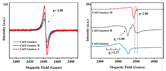 The electron paramagnetic resonance (EPR) was derived to detect the oxygen vacancies on the catalyst surface and the hyperfine structure of the copper species, and the results are shown in Figure 6. It can be seen from Figure 6a that there appears a signal of oxygen vacancy at g = 2.00 of the CuO/anatase, CuO/anatase-B and CuO/anatase-H catalysts [20]. Compared with the CuO/anatase, the oxygen vacancy signal of the catalyst after reduction is significantly increased (CuO/anatase-B and CuO/anatase-H catalysts). Compared with the CuO/anatase-B catalyst, the oxygen vacancy signal intensity of the CuO/anatase-H catalyst is larger, which suggests that the H2 reduction treatments are much easier for generating oxygen vacancies on the anatase surface. As shown in Figure 6b, for the CuO/anatase, CuO/anatase-B and CuO/anatase-H catalysts, there are fine structure signals with a parallel component of g∥ = 2.37 and a vertical component of g⊥ = 2.08 in the spectral line, which are attributed to the signal of the Cu2+ species. In addition, there are no lone pair electrons in the Cu+ orbital, so there is no signal of Cu+ that appears [34].