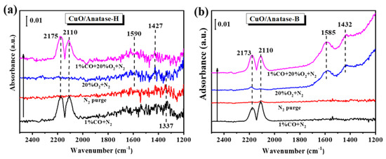 As shown in Figure 8, the in situ diffuse reflectance Fourier transform infrared spectra (DRIFTS) were recorded to verify the role of the oxygen vacancies constructed by different methods and the role of Cu species in CO catalytic oxidation. As shown in Figure 8a, after the CO atmosphere (black curve) was introduced into the reaction cell, bands at 2175 and 2110 cm−1 appeared on the CuO/anatase-H catalyst surface, which are attributed to the CO adsorbed on Cu2+ and Cu+, respectively [33]. The bands at 1590, 1427 and 1337 cm−1 are assigned to the carbonate intermediates, which indicate that CO can react with the surface oxygen species on the CuO/anatase-H catalyst even without gas phase O2 [15]. The CO oxidation on the CuO/anatase-H catalyst can follow the MvK pathway. Subsequently, the catalyst surface was purged by N2 and the O2 (pink curve, Figure 8a). The intensity of the band at 1590 and 1427 cm−1 was strengthened evidently, indicating that the CO adsorbed on the catalyst surface can also react with oxygen molecules.