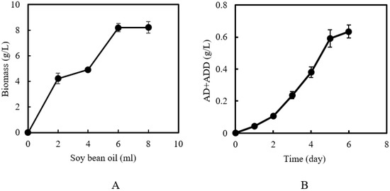Soybean oil acting as both a substrate for microbial growth and a solvent for solubilized phytosterols: (A) Microbial culture with soybean oil as the sole carbon source. The microbial culture was carried out in the aqueous culture medium (40 mL) in the absence of glucose and with various volumes of soybean oil for 6 days. (B) Time course of microbial transformation of phytosterols in a water–soybean oil two-phase system. The basic condition was the aqueous culture medium in the absence of glucose (40 mL) and soybean oil (10 mL) with 25 g/L phytosterols.