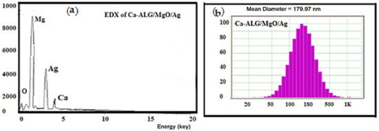 EDX was used for elemental identification and for determining the composition of Ca-ALG/MgO/Ag nanocomposite beads, as shown in Figure 1a. The particle size of the Ca-ALG/MgO/Ag was determined by using DLS. Results obtained from Figure 1b revealed that the average particle size was estimated to be 178 nm.