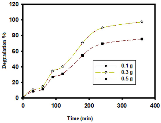 The standard solution of Direct Red 83 dye 100 mg/L was degraded at 300 min with varied amounts of Ca-ALG/MgO/Ag nanocomposite beads ranging from 0.1 to 0.5 g. The catalyst amount was chosen based on the percentage of dye decolorization that occurred over time. Figure 5 depicts the results of dye degradation at various catalyst amounts. It can be seen that the degradation percentage increases with an increase in the catalyst amount until 0.3 gm. However, beyond 0.3 g, there is no change in the degradation of Direct Red 83 dye. Other researchers also found the same characteristics [27,28]. The result in Figure 5 also reveals that the degradation percentage of the dye increases with an increase in the amount of catalyst Ca-ALG/MgO/Ag nanocomposite beads up to 0.3 g. The increase in the amount of catalyst in the reaction mixture is accompanied by an enhanced generation of •OH radicals, which, consequently, increases the rate of degradation. This may be due to the fact that, initially, the increase in the amount of catalyst increases the number of active sites on the catalyst surface, which, in turn, increases the number of hydroxyl radicals. After a certain level of catalyst (0.3 g), the rate of reaction decreases because the dye molecules are not available for adsorption on active sites of the catalyst. The additional catalyst particles, therefore, are not involved in the catalytic activity. Hence the rate of degradation does not increase [29]. Regarding the results obtained, the optimum catalyst amount of 0.3 g at 100 mg/L dye concentration and 3 mL of 1 M NaBH4 showed the highest catalytic degradation of Direct Red 83 dye.