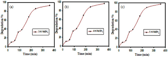 The influence of the reducing agent’s content on the catalytic degradation percent was studied from 3 to 5 mL at 30 °C using 0.3 g of Ca-ALG/MgO/Ag nanocomposite beads as a catalyst and a Direct Red 83 dye concentration of 100 mg/L.