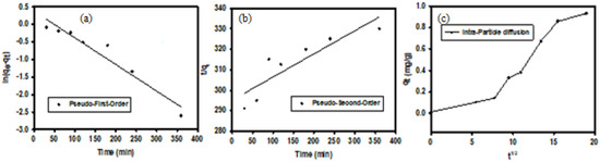 (a) pseudo-first-order kinetics, (b) pseudo-second-order kinetics, and (c) intra-particle diffusion model of Direct Red 83 dye degradation.
