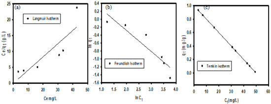 (a) Langmuir isotherm model, (b) Freundlich isotherm model, and (c) Temkin isotherm of Ca-ALG/MgO/Ag nanocomposite beads.