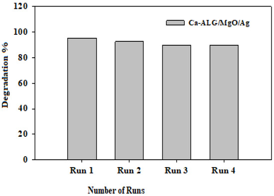 The reusability test of the prepared Ca-ALG/MgO/Ag nanocomposite beads as a catalyst for the degradation of Direct Red 83 dye was conducted through continuous four-run recycle under conditions (temperature, 30 °C; reaction time, 48 h; natural pH; catalyst dosage, 0.3 g; initial concentration of dye, 50 mg/L). Figure 11 clearly shows that the degradation percentage of Direct Red 83 dye after four-run recycle decreased to 90% only. The result proved that Ca-ALG/MgO/Ag nanocomposite beads have excellent performance and long-term stability.