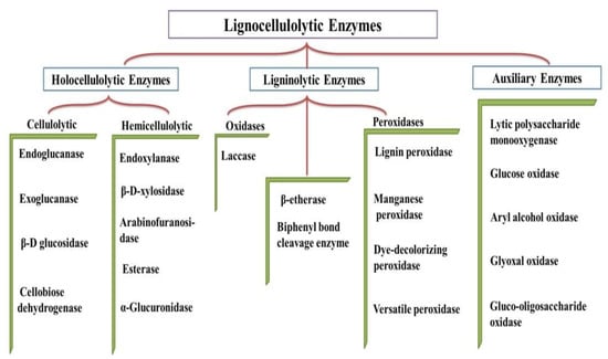 Profusely present lignocellulosic biomass (LB) may serve as an intriguing substitute to non-renewable natural resources to produce energy in a viable way [9]. Tons of lignocellulosic biomass in the form of agro-industries, crop waste, weed biomass, and plant waste are generated annually worldwide. This biomass is either burnt causing air pollution or dumped in the landfills [6,10]. Nevertheless, a “waste to use” program can be applied wherein LB, which is rich in carbohydrates such as cellulose (32–54%), hemicellulose (11–37%), and non-carbohydrate polymer lignin (17–32%) can be exploited for generating multiple value- and energy-added products, viz., biofuel, organic acids, bioplastics, hydrogels, vanillin, resins, etc. [5,11]. Cellulose, lignin, and hemicellulose are linked together in an intense complex bonding that provide the plant cell wall with a rigid and tough nature, which therefore are not easily accessible for value addition. The production of valuable biochemicals from LB involves the extraction of a particular biopolymer, followed by its breakdown and subsequent conversion into the desired product [12]. However, the natural recalcitrance of LB and high processing cost impedes the extraction and conversion process [13,14]. Numerous physical, chemical, biological, or integrative methods have been tested to break down lignocellulosic biomass and reduce its inherently rebellious nature [5,12,13,14,15,16]. However, most of the physical, chemical, or physicochemical pretreatment strategies are very energy and cost intensive, and may result in the production of inhibitory products, restricting the upscaling of the biomass processing. On the contrary, the LB valorization by biological methods is an environmentally benign approach which involves the use of different lignocellulolytic enzymes from different microorganisms [17,18]. Enzymes are regarded as “green” industrial chemicals with a wide array of industrial applications and can be employed in environmentally friendly bioprocesses [19]. Diverse lignocellulolytic enzymes such as cellulases and hemicellulases attack and break down cellulose and hemicellulose into simpler sugars for subsequent conversion into different products, whereas ligninolytic enzymes break down lignin into different aromatic compounds [18]. Moreover, various auxiliary enzymes, such as glucose oxidase, aryl alcohol oxidase, glyoxal oxidase and gluco-oligosaccharide oxidase, aid in enhancing the activity of peroxidases and promote lignin disruption, while lytic polysaccharide monooxygenases play a role in the degradation of crystalline cellulose (Figure 1). The enzymatic conversion of lignocellulose offers the advantage of being highly specific and cost effective with minimal or no production of inhibitors [20]. Numerous variables, including the source of the enzyme, the substrate, and the amount and type of enzymes involved, influence the reaction rate of enzymatic hydrolysis and overall effectiveness in the degradation of lignocellulosic biomass [18].