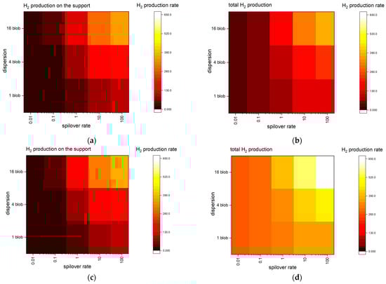 Heatmaps for H2 production when the Heyrovsky reaction is slow as a function of catalyst dispersion and the spillover rate: (a) production from the support for the C@S configuration; (b) total production for the C@S configuration; (c) production from the support for the S@C configuration; (d) total production for the S@C configuration.