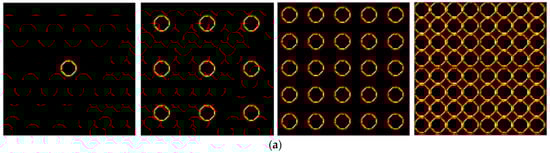 In the next set of simulations, we considered the effects of metal coverage. Different numbers of catalyst/support islands were placed uniformly on the support/catalyst (Figure 2a). In parallel, we varied the rates of Hads diffusion on the support (Equation (4)) and the rate of H2 desorption from the support (Equation (5)) between 1 and 100. However, for one simulation, we set the rates of the processes (4) and (5) to be equal (thus, 1–1, 10–10, and 100–100). Namely, diffusion barrier scales with Hads binding energy [], while Hads recombination will also be faster for the weaker binding surfaces. For each pair of the considered rate, spillover rate amounting to 0.01, 1, and 100 was tested. Figure 2b–e shows the results for the 100–100 pair of rates of reaction (4) and (5).