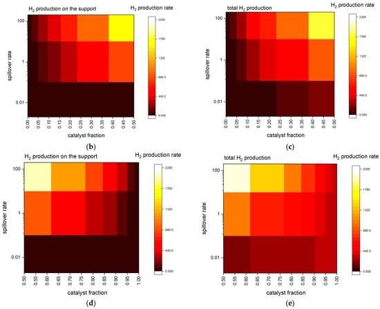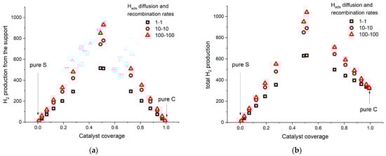 In the first set of calculations, we considered the case when Equation (1) is slower than all the other processes in the model (formal rate 0.01, all the other rates 1 or higher). This situation corresponds to slow water dissociation and formation of Hads, which is generally considered cumbersome for HER in alkaline media [,]. However, the situation is different for high HER overvoltages, where Hads formation becomes faster and Hads removal becomes the rate-determining step (RDS). For example, in the case of polycrystalline Ni, it was explicitly shown that the Heyrovsky reaction is the RDS at higher HER overvoltages, while the surface coverage by Hads is high. However, the metallic surfaces that bind Hads weakly, such as Ag and Au, will retain a low water dissociation rate and Hads coverage. In this case, the spillover rate and Hads desorption rate from S do not affect the total H2 production, while negligible amounts of H2 are formed via reaction (5). In this case, metal coverage by Hads is very low, below 0.01 monolayer (ML). Thus, Hads has a low probability of spilling on the support, irrespective of the spillover rate. For such a scenario, we can conclude that spillover has no significant effect on H2 production. Additionally, catalyst dispersion does not affect the H2 production rate in this case.