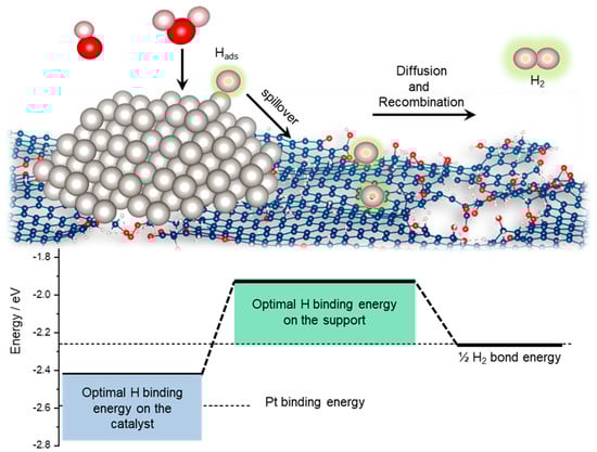 Schematic representation of the spillover process and H2 production on the rGO-support metal catalyst with the energy profile for the considered reaction path.